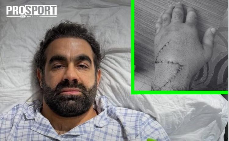 Prosport.Az-ın xəbərinə görə, 40 yaşlı idmançı həm burnundakı çəpər əyriliyindən, həm də sol əlindəki 3 qırıq sümüyə görə həkim bıçağı altına yatıb.