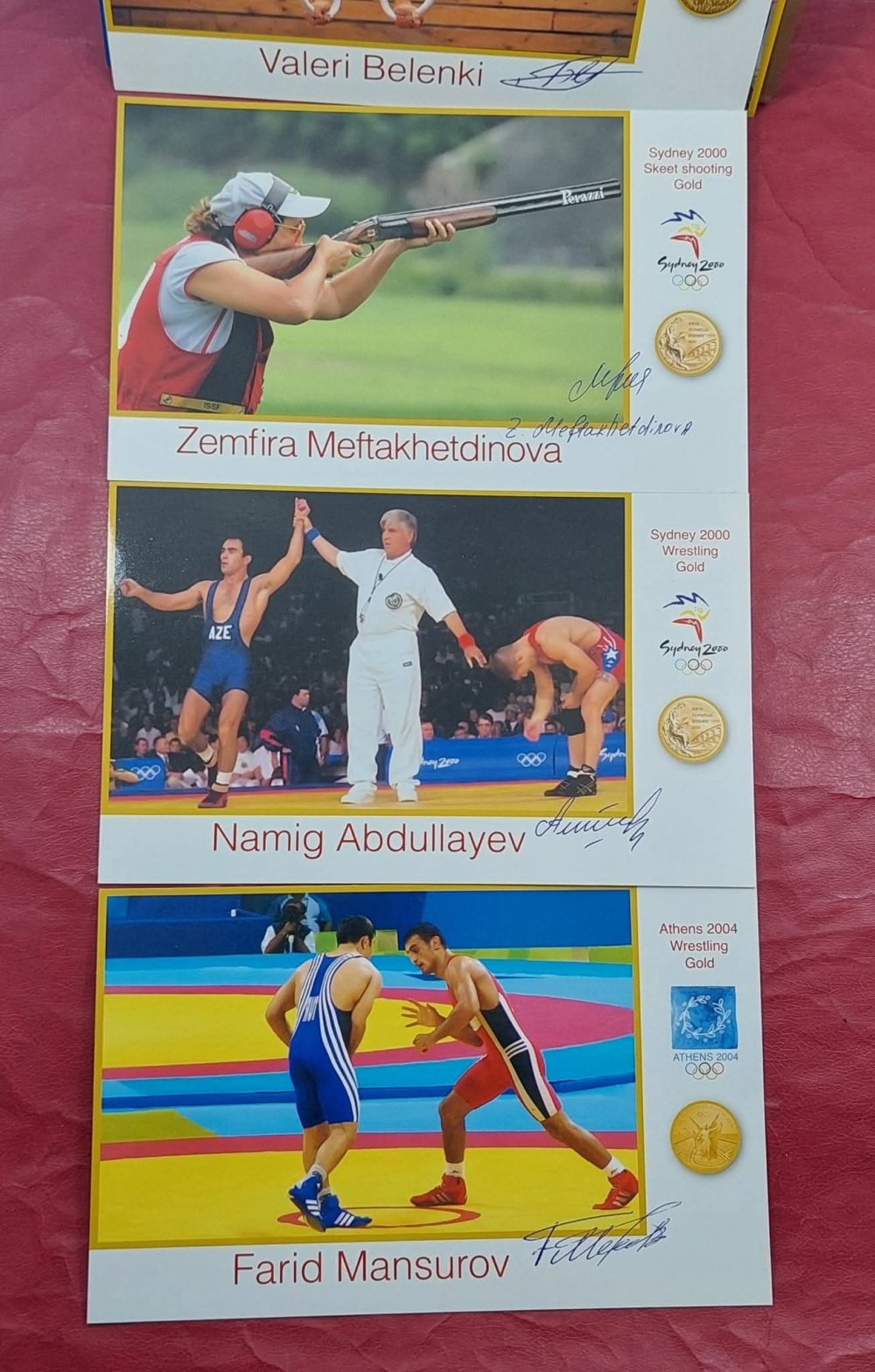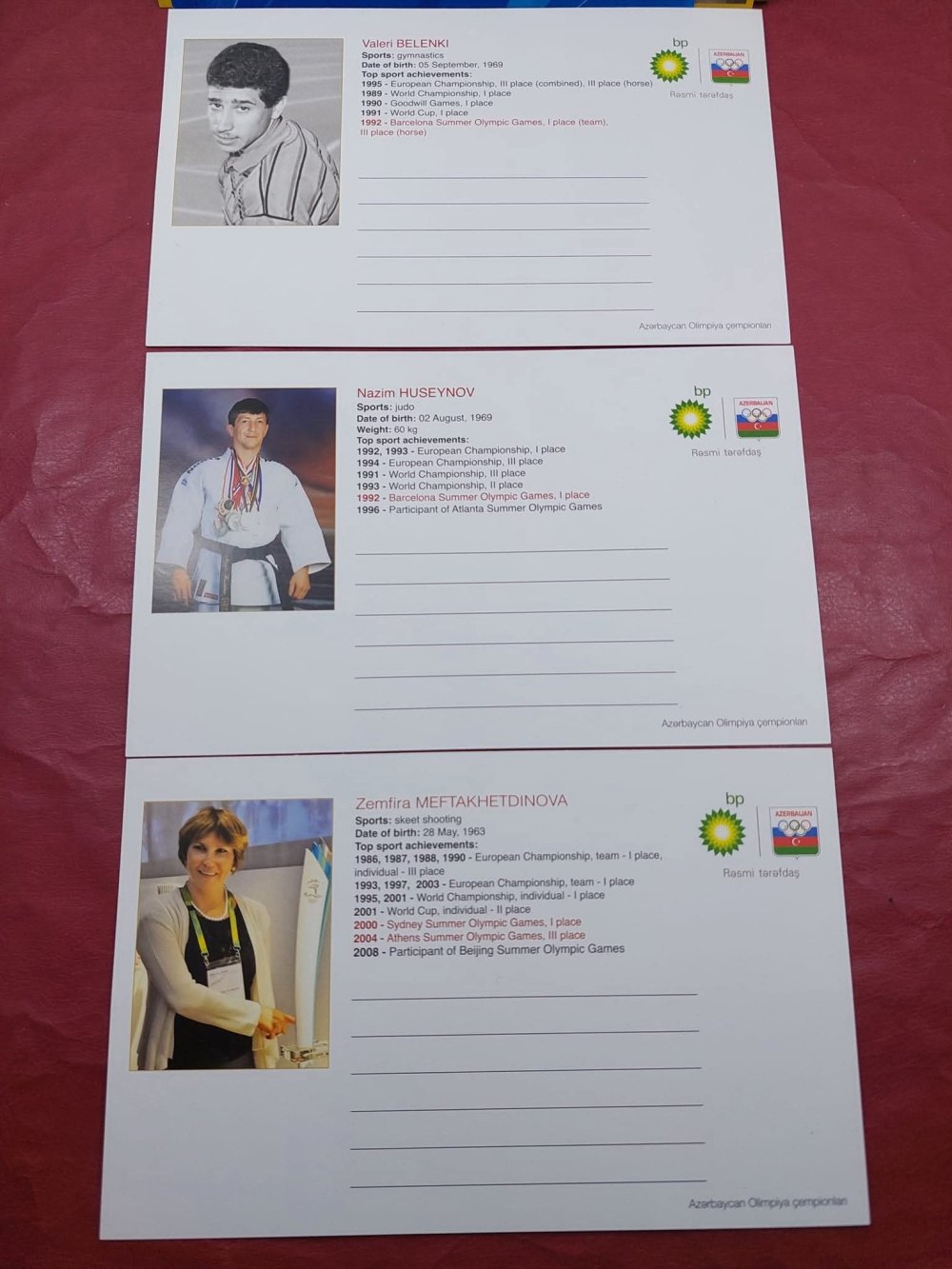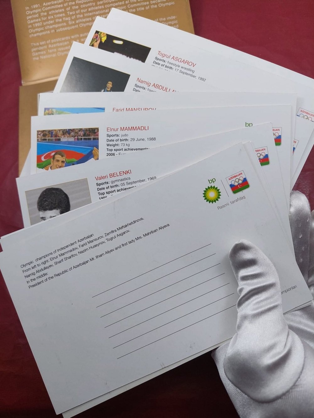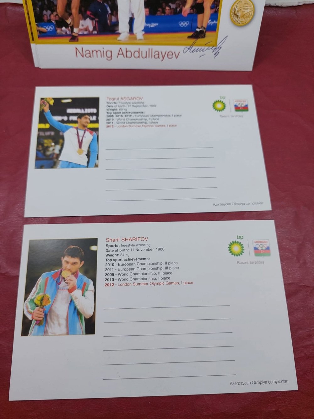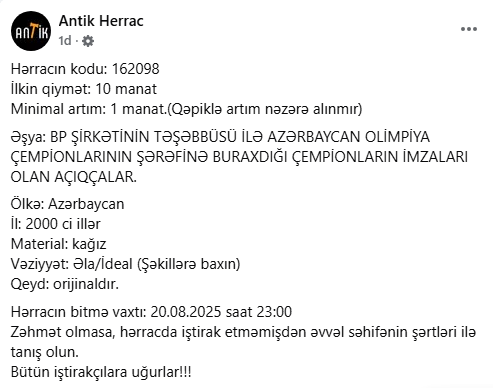 Yeri gəlmişkən, "Antik Hərrac" səhifəsində BP şirkətinin təşəbbüsü ilə Azərbaycan olimpiya çempionlarının şərəfinə buraxdığı açıqcalar da ilkin qiyməti 10 manatdan hərraca çıxarılıb. Bu açıqcalarda olimpiya çempionları – Nazim Hüseynov, Valeri Belenki, Zemfira Meftaxetdinova, Namiq Abdullayev, Fərid Mansurov, Elnur Məmmədli, Şərif Şərifov və Toğrul Əsgərovun şəxsi imzaları var.