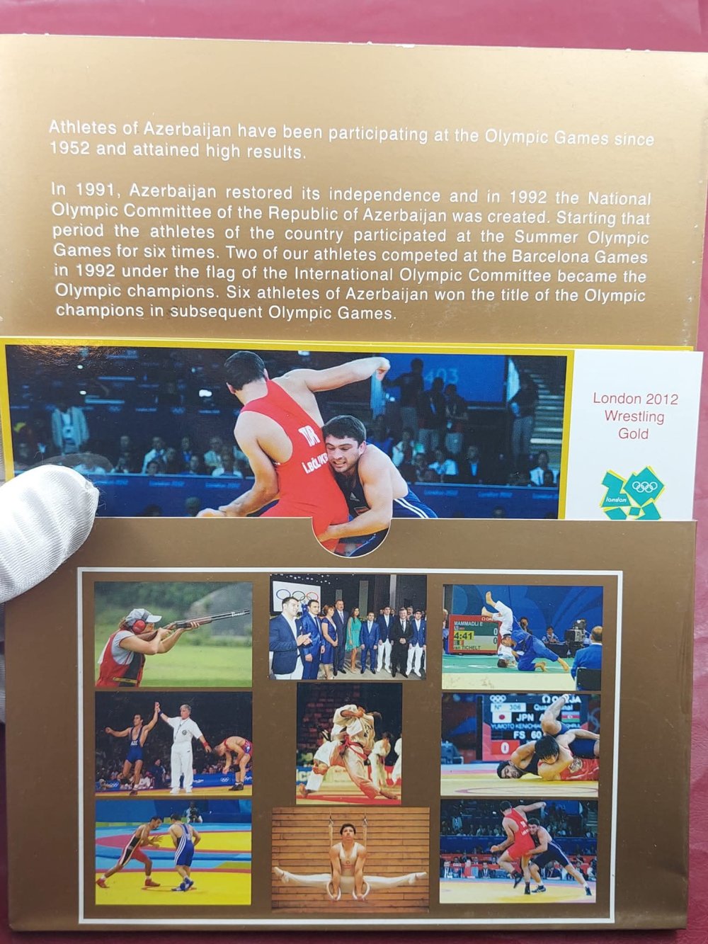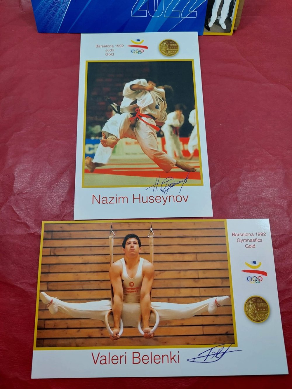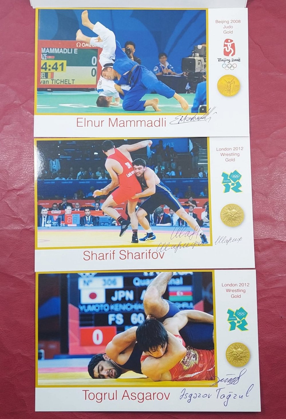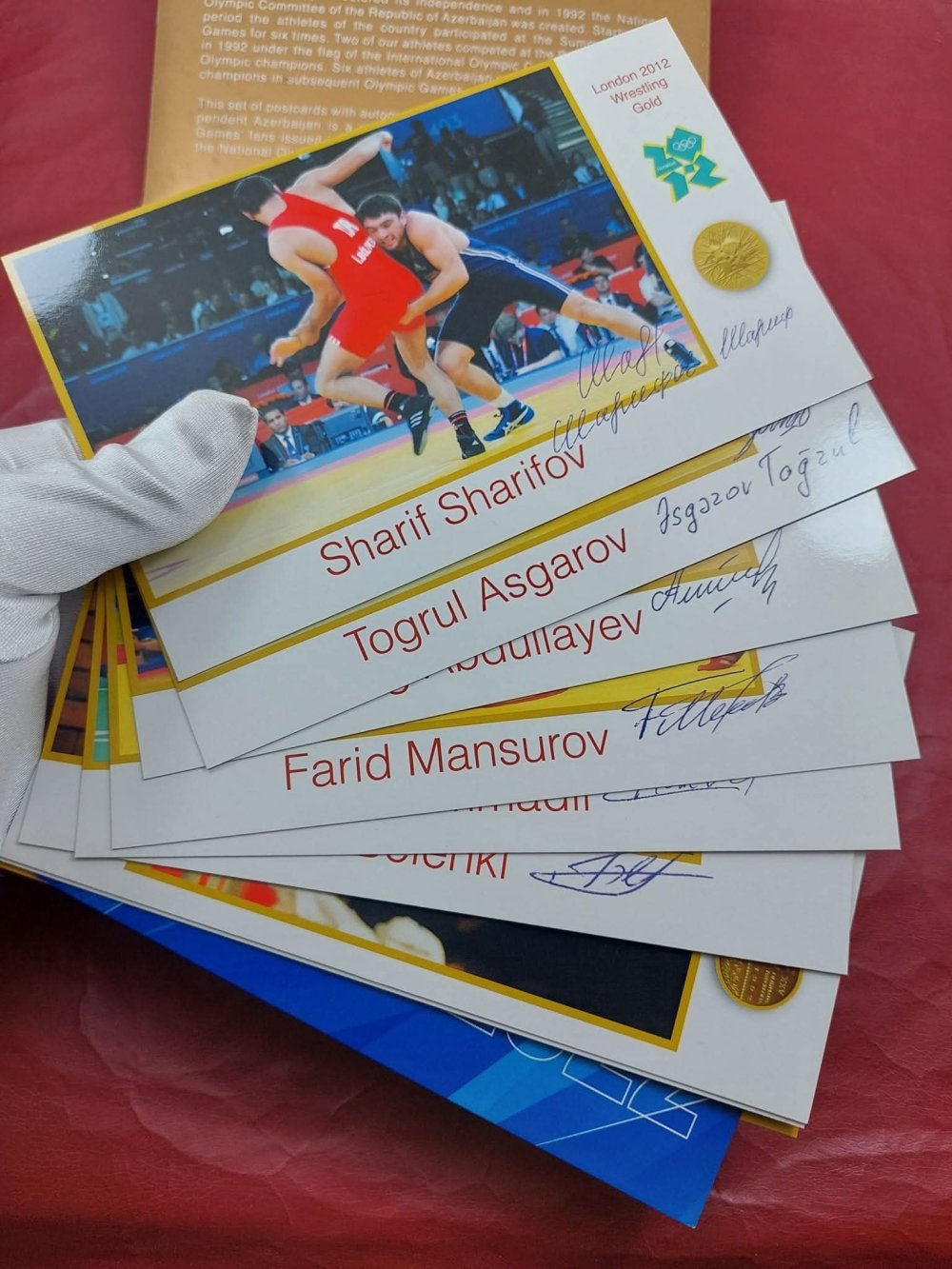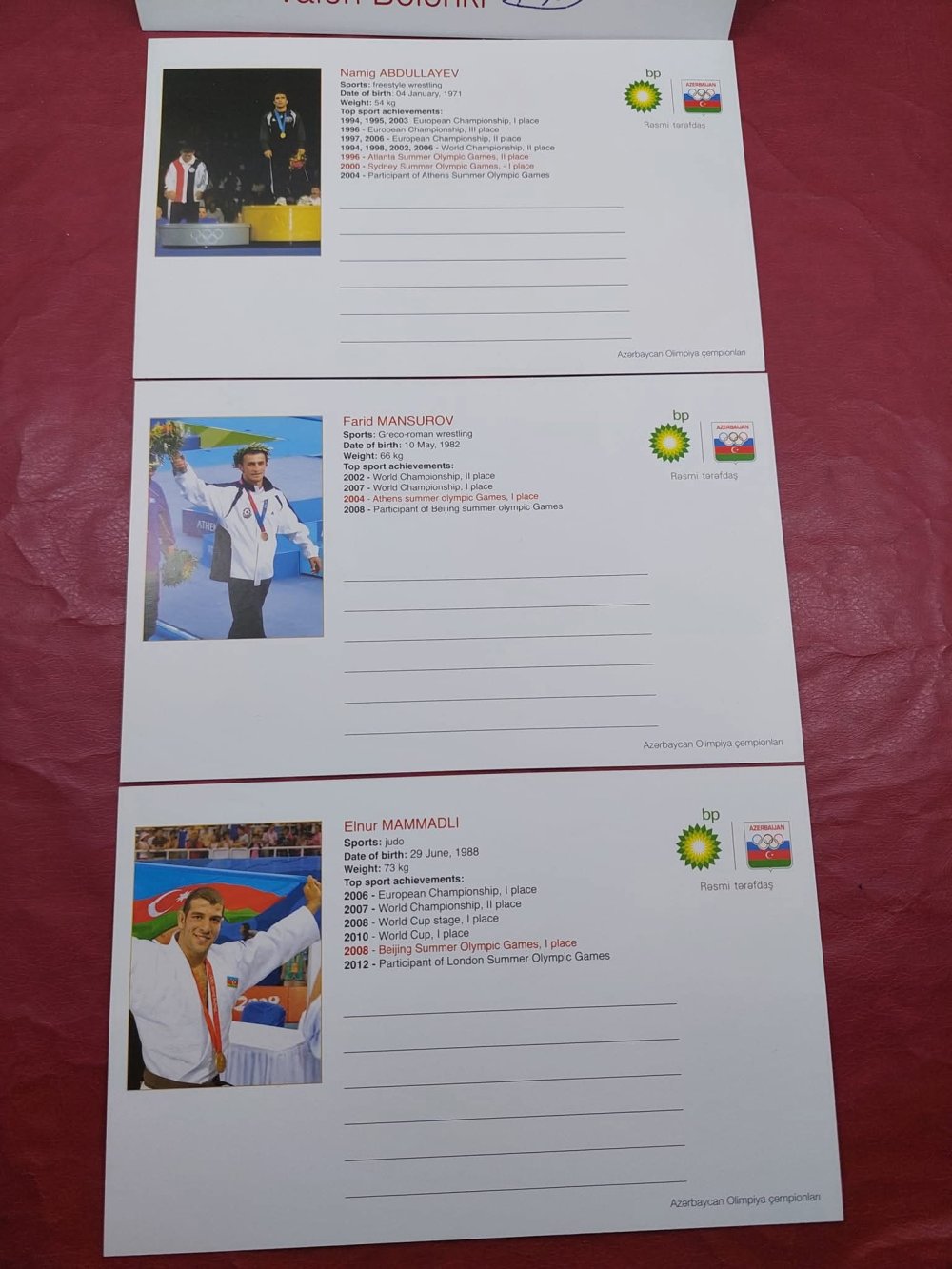 Yeri gəlmişkən, "Antik Hərrac" səhifəsində BP şirkətinin təşəbbüsü ilə Azərbaycan olimpiya çempionlarının şərəfinə buraxdığı açıqcalar da ilkin qiyməti 10 manatdan hərraca çıxarılıb. Bu açıqcalarda olimpiya çempionları – Nazim Hüseynov, Valeri Belenki, Zemfira Meftaxetdinova, Namiq Abdullayev, Fərid Mansurov, Elnur Məmmədli, Şərif Şərifov və Toğrul Əsgərovun şəxsi imzaları var.