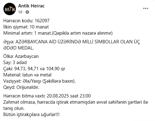 Prosport.Az-ın xəbərinə görə, "Antik Hərrac" səhifəsində 3 ədəd – materialı latun və metaldan olan 94.73, 94.71 və 104.90 qramlıq medallar satışa hərraca qoyulub.