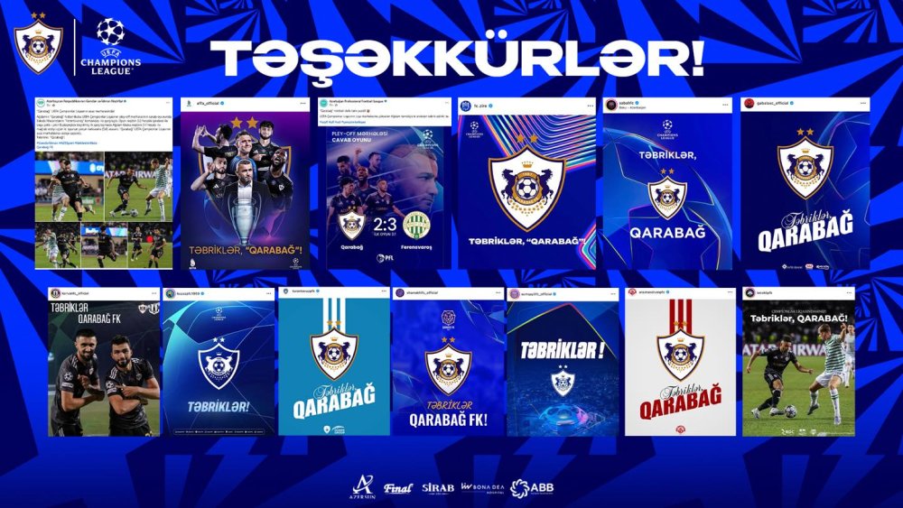 "Qarabağ" UEFA Çempionlar Liqasının əsas mərhələsinə yüksəlməsinə görə kluba təbrik ünvanlayan idman təşkilatları və futbol komandalarına təşəkkür edib.