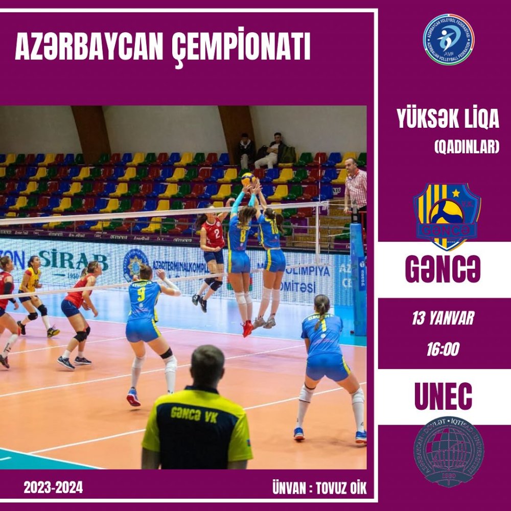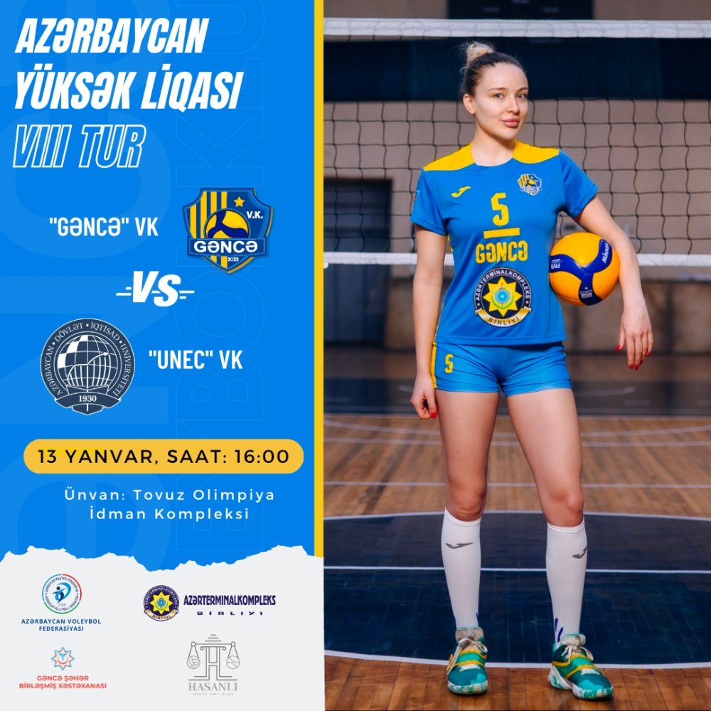 Prosport.Az xəbər verir ki, sabah qadın voleybolçuların Yüksək Liqasında II dövrə çərçivəsində VIII turun “Gəncə” – UNEC qarşılaşması baş tutacaq.